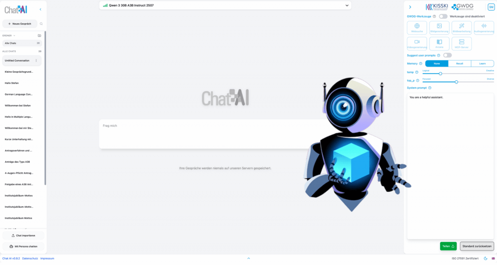 Chat AI in der Academic Cloud der GWDG bietet eine starke Unterstützung für die tägliche Arbeit in der Verwaltung. Damit die Möglichkeiten von KI im Arbeitsalltag wirklich nutzbar werden, ist eine fundierte Einführung entscheidend. Unser Chat AI E-Learning qualifiziert Ihre Nutzenden praxisorientiert und macht sie schnell fit für den professionellen Einsatz von Chat AI.